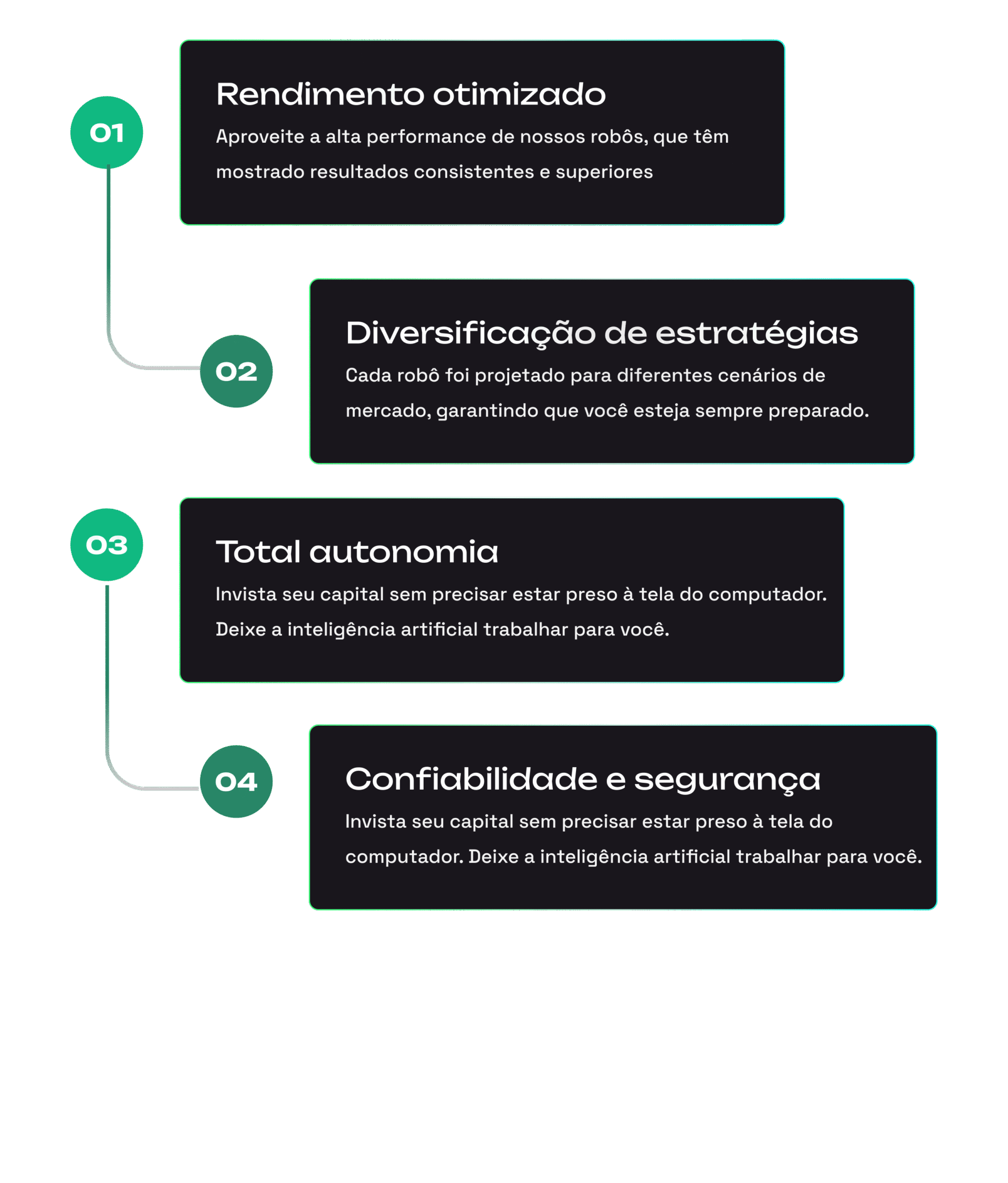 Nossos robôs são projetados para oferecer alta rentabilidade, com algoritmos inteligentes e otimizados para qualquer cenário de mercado.
